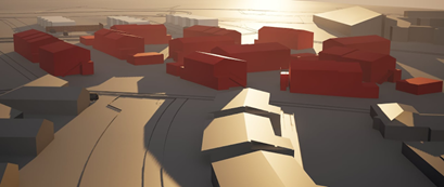 MYND 5: yFIRLITSMYND - RAUÐAR BYGGINGAR SÝNA FYRIRHUGAÐA BYGGÐ